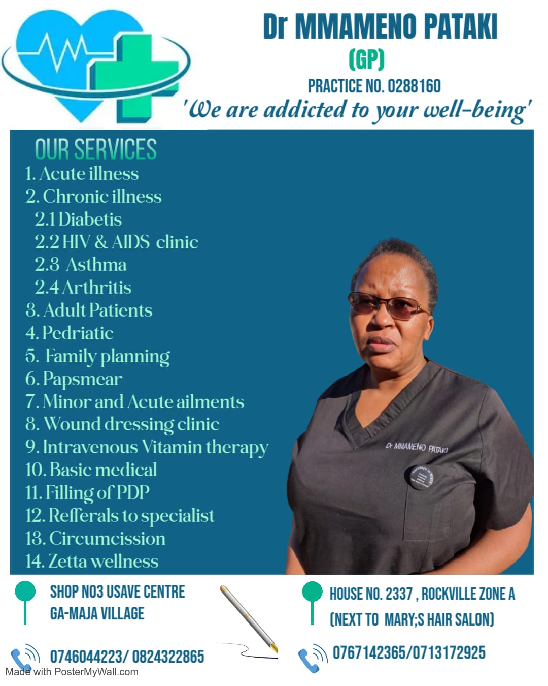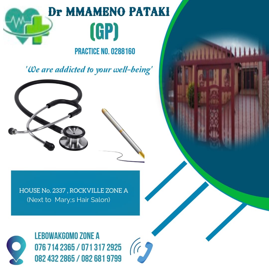 General Practioner in Lebowakgomo & Ga-Maja (Usave Shopping Centre). Treating acute minor ailment of children and adults. Management of chronic diseases such as diabetes mellites, hypertension, asthma, epilepsy, heart failure, arthritis.